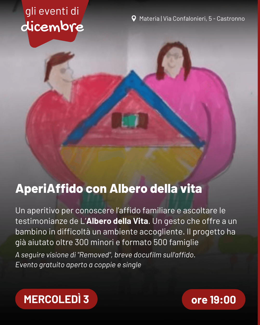 Un aperitivo insieme per conoscere l’affido familiare e ascoltare le testimonianze di famiglie e operatori de L'Albero della Vita. Un gesto di accoglienza che offre a un bambino, in un momento difficile, la possibilità di crescere in un ambiente familiare. Il progetto ha già dato una famiglia a oltre 300 minori e formato 500 nuclei. A seguire visione di "Removed", breve docufilm sull'affido.