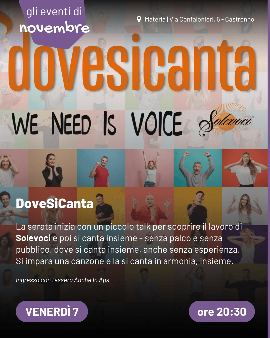 Un progetto in collaborazione con Solevoci. La serata inizia con una mezz’ora di talk per scoprire il lavoro e l’esperienza di Solevoci, poi si canta insieme — senza palco e senza pubblico, anche senza esperienza. Un incontro spontaneo, un’unica voce fatta di tante: si impara una canzone e la si canta in armonia, semplicemente, insieme.