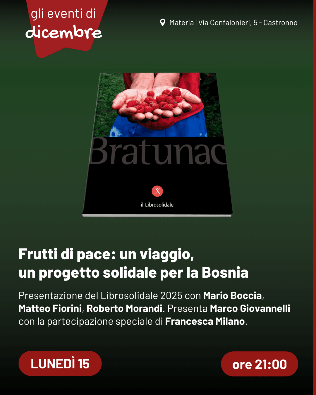Per i suoi 25 anni, l’associazione Xmas Project di Milano dedica il suo Librosolidale alla Pace, attraverso la storia della cooperativa Insieme di Bratunac, nell'area di Srebrenica, teatro del genocidio della popolazione bosniaca di religione musulmana da parte dei nazionalisti serbi.