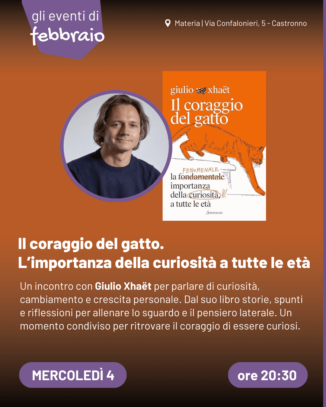 Un dialogo aperto su come coltivare domande, esplorare strade nuove e restare vivi mentalmente. Dal suo libro Il coraggio del gatto, storie, spunti e riflessioni per allenare lo sguardo e il pensiero laterale. Un momento condiviso per ritrovare il coraggio di essere curiosi.