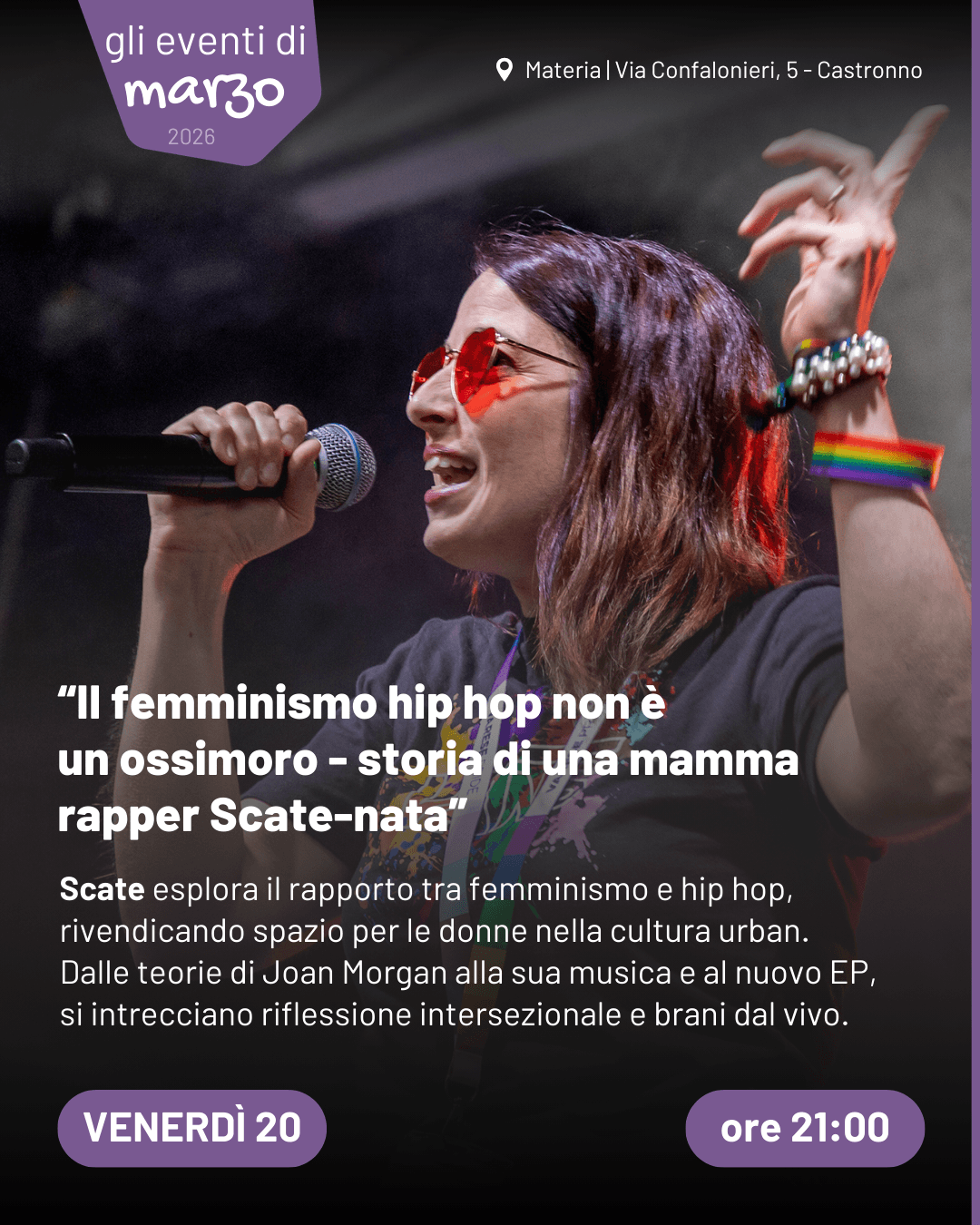 Scate esplora il rapporto tra femminismo e hip hop, rivendicando spazio per le donne nella cultura urban. Dalle teorie di Joan Morgan alla sua musica e al nuovo EP, si intrecciano riflessione intersezionale e brani dal vivo. Una serata di ascolto e autoanalisi collettiva che usa il ritmo per sfidare il patriarcato.