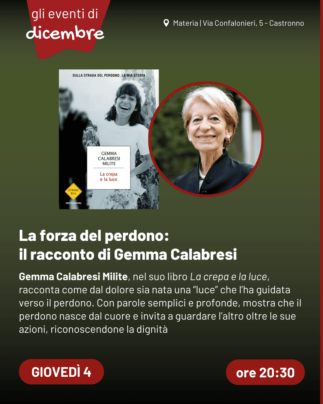 La testimonianza di Gemma Calabresi Milite. Nel libro La crepa e la luce rivela come, tra la “crepa” del dolore, sia germogliata una “luce” capace di guidarla verso il perdono. Con semplicità e profondità, Gemma condivide un messaggio radicale: non si perdona con la ragione, ma con il cuore. Il risultato è un cammino autentico che invita a guardare l’altro oltre le sue azioni e a riconoscerne la dignità.