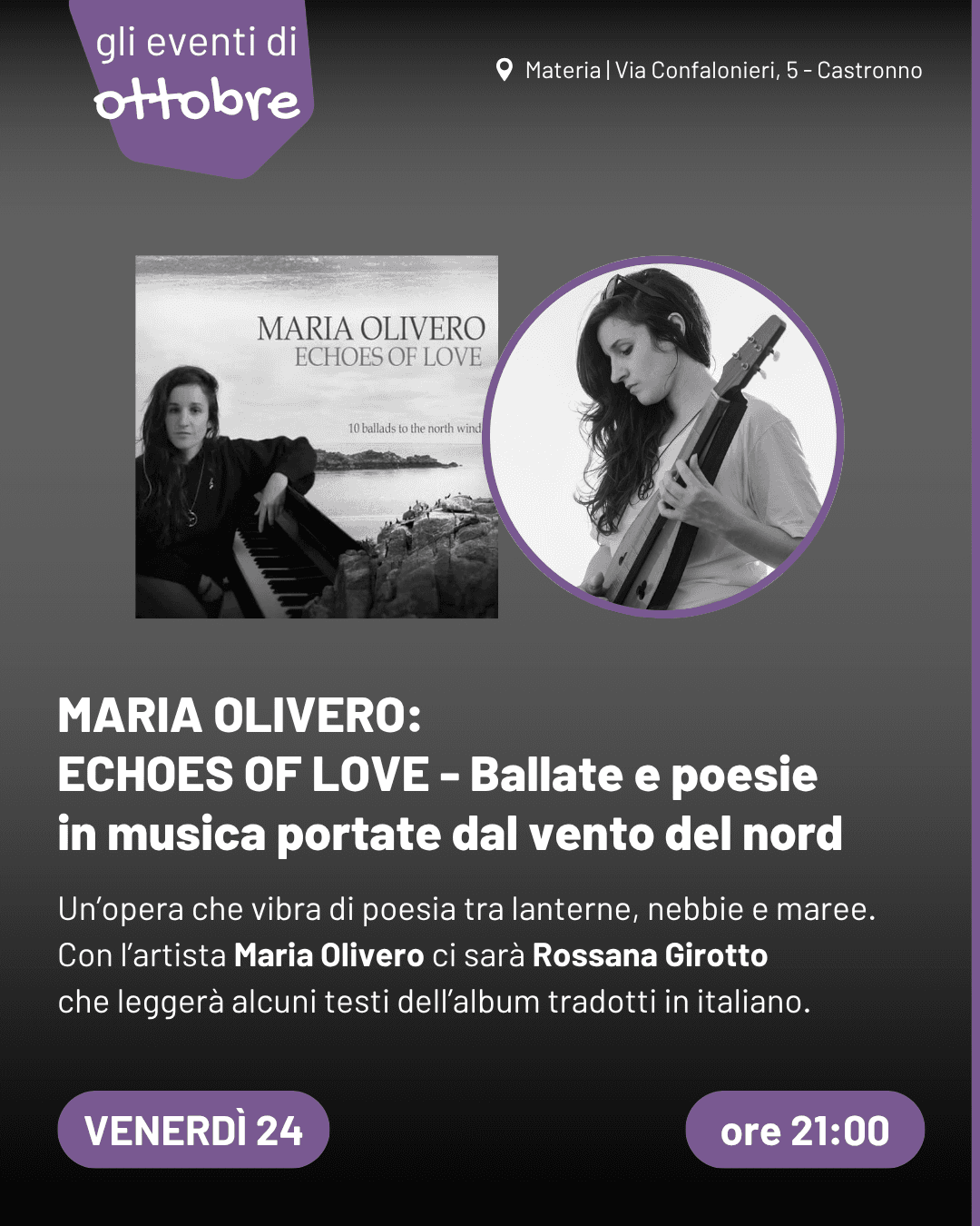 Un intreccio di ballate dedicate alle donne della letteratura e ai paesaggi dell’Europa settentrionale. La musica di Maria Olivero unisce il respiro del vento del nord, le suggestioni fin de siècle e la memoria di voci femminili. Un’opera che vibra di poesia tra lanterne, nebbie e maree. Ad accompagnare l’artista ci sarà Rossana Girotto, che leggerà alcuni testi in italiano tradotti dall’album.
