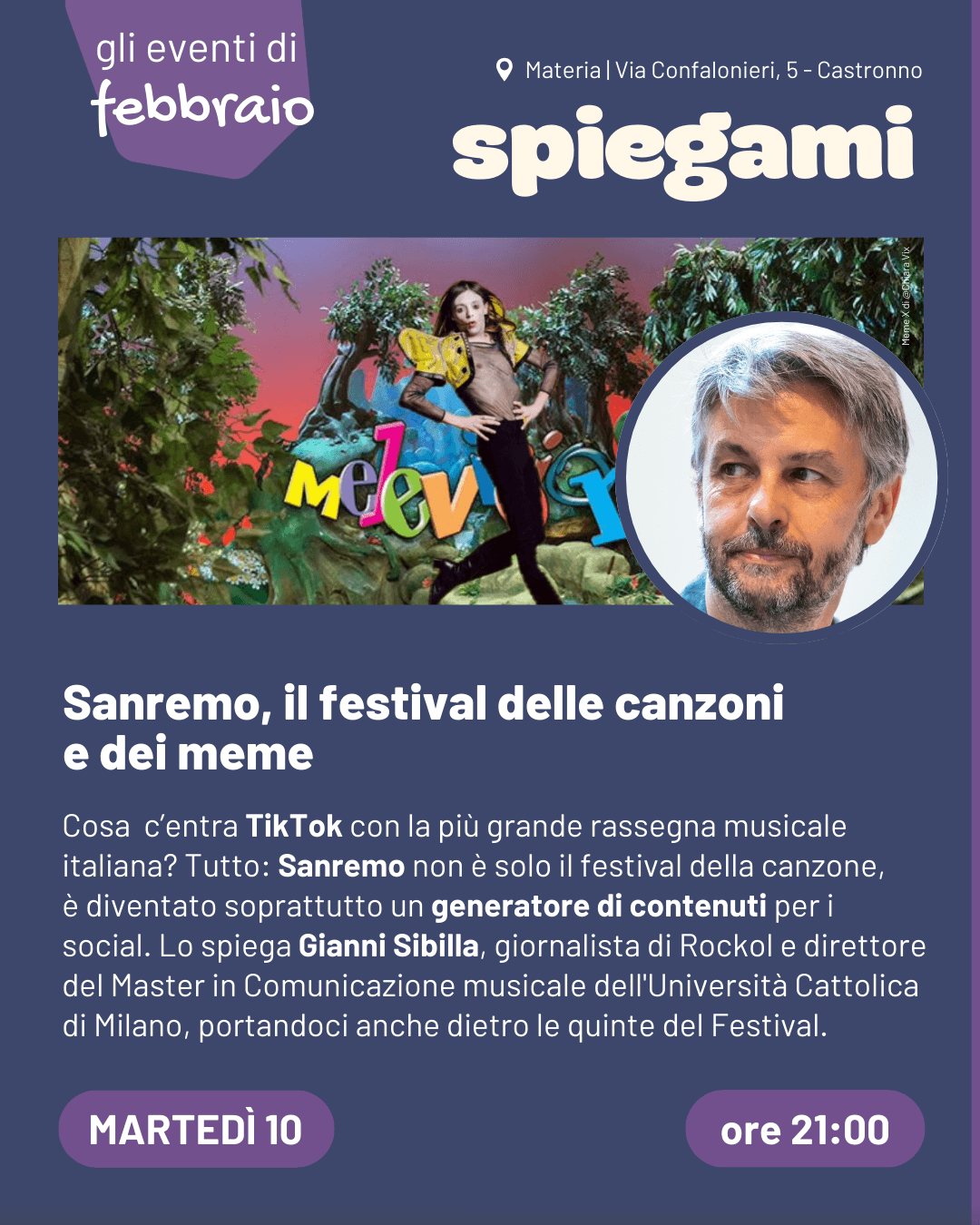 Cosa c’entra TikTok con la più grande rassegna musicale italiana? Tutto: Sanremo non è solo il festival della canzone, è diventato soprattutto un generatore di contenuti per i social media. I meme, a loro volta, sono il più potente (e incontrollabile) strumento per lanciare o riscoprire una canzone o un artista. Un incontro per capire come funziona oggi il festival di Sanremo. E i meme.