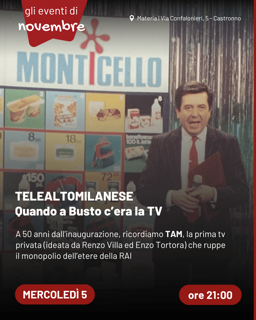 A 50 anni dall'inaugurazione, ricordiamo TAM, la prima tv privata (ideata da Renzo Villa ed Enzo Tortora) che ruppe il monopolio dell’etere della RAI. Video e foto d’epoca commentati da Ettore Andenna, Enrico Beruschi, due docenti di storia della tv e da Marta Cagnola giornalista di Radio24